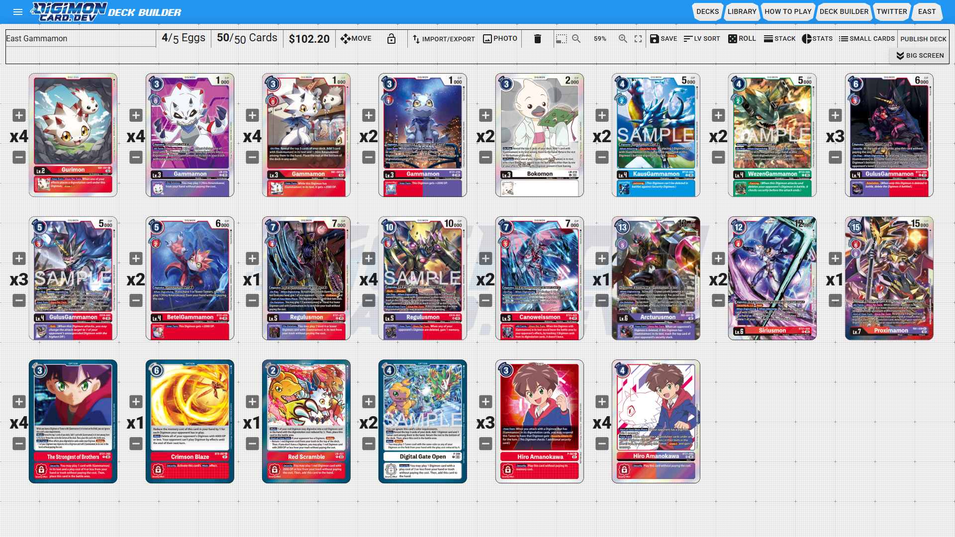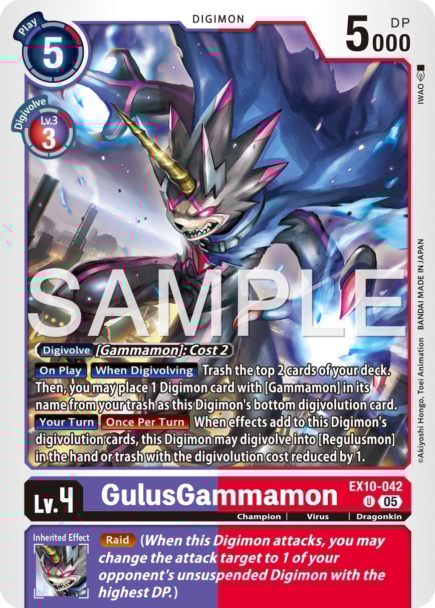 With the current popularity of decks like Hudiemon and Jesmon, I needed to put together a deck that has some speed, but I wanted to allow for some counter play against those aforementioned decks as well. The older version of Gammamon had you build up to a level 6 Siriusmon who could make 2 checks while deleting threats on board, but honestly I felt this was not fast enough. Instead I used the new EX10 Regulusmon as the “boss monster” for the deck. His ability to delete while also attacking without suspending seems really good, especially considering that last effect happens at End of Turn, as long as he has at least 5 sources. Utilizing cards like the BT21 Hiro Amanokawa, EX10 GulusGammamon, and The Strongest of Brothers option card, I had multiple ways to go into Regulusmon at some memory discount.