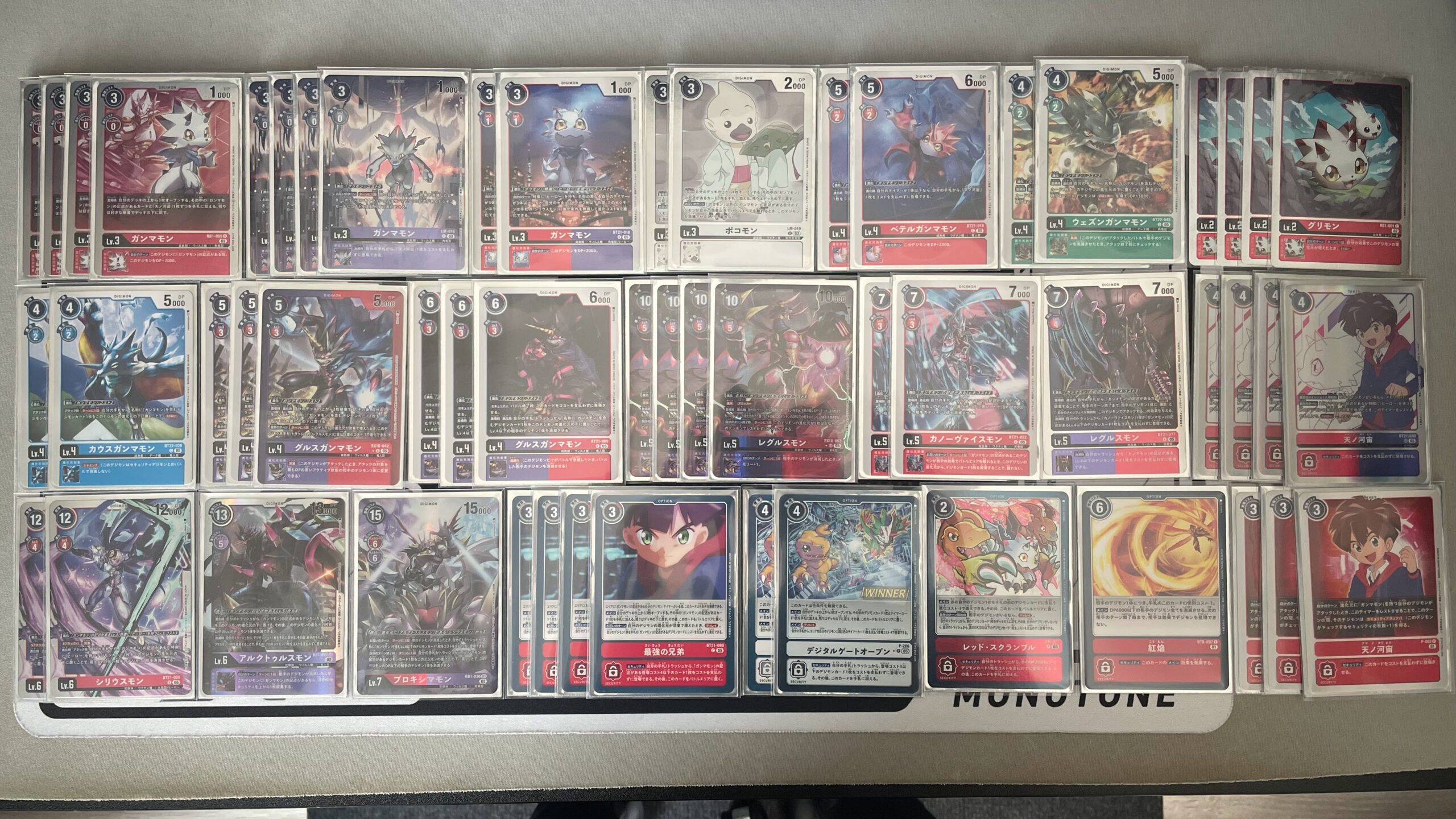 With that core in mind, I needed to make sure I included at least 5 differently named cards so that in a pinch, I could simply drop a Regulusmon and immediately be able to delete a Digimon and attack, as per his effect. This meant adding in KausGammaon, BetelGamamon, and WezenGammamon (all cards who names I cannot pronounce correctly in real life lol), and I needed a way to get down tamers very quickly. This is what prompted the use of the purple LM06 Gammamon. Between BetelGammamon and purple Gammamon I felt it was adequate, but I really wanted to push the tamer search and play-ability of the deck so I added in 2 copies of the new promo card, “Digital Gate Open”, with this, I could search out a Tamer and any Digimon in the deck, and then on later turns, for free, simply play a Hiro Tamer to get Sec +1